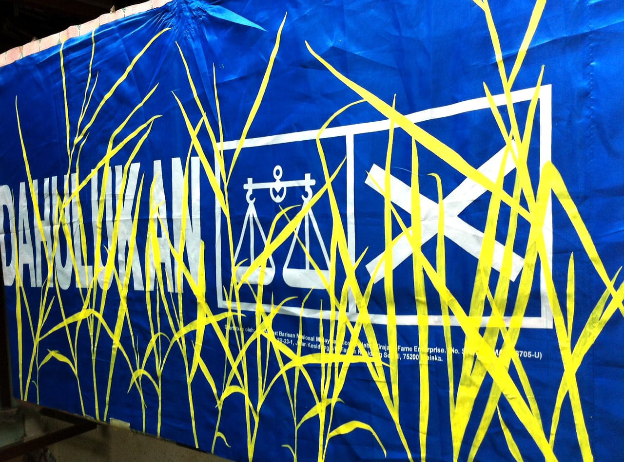 I made 'Weeds/Rumpai' in 2012 - 2013. We’d moved from KL to Port Dickson the year before. The whole of that long, dry, year I made no art at all - there was no water in my well. I read Ursula Le Guin’s speculative fiction masterpiece The Dispossessed, and was beginning to read Murray Bookchin on libertarian municipalism. From Le Guin I learned about anarchism, from Bookchin I learned that politics is not the same as statecraft. That the word comes from the Greek word ‘polis’, meaning ‘city’ or a ‘body of citizens’. I also spent many hours staring out blanky into my garden, wondering what I’d do if I never made art again. So I started drawing the weeds, one a day, as a silly exercise. Then flags started sprouting up around Port Dickson ahead of GE13. I thought I’d put these together, and see what happened.