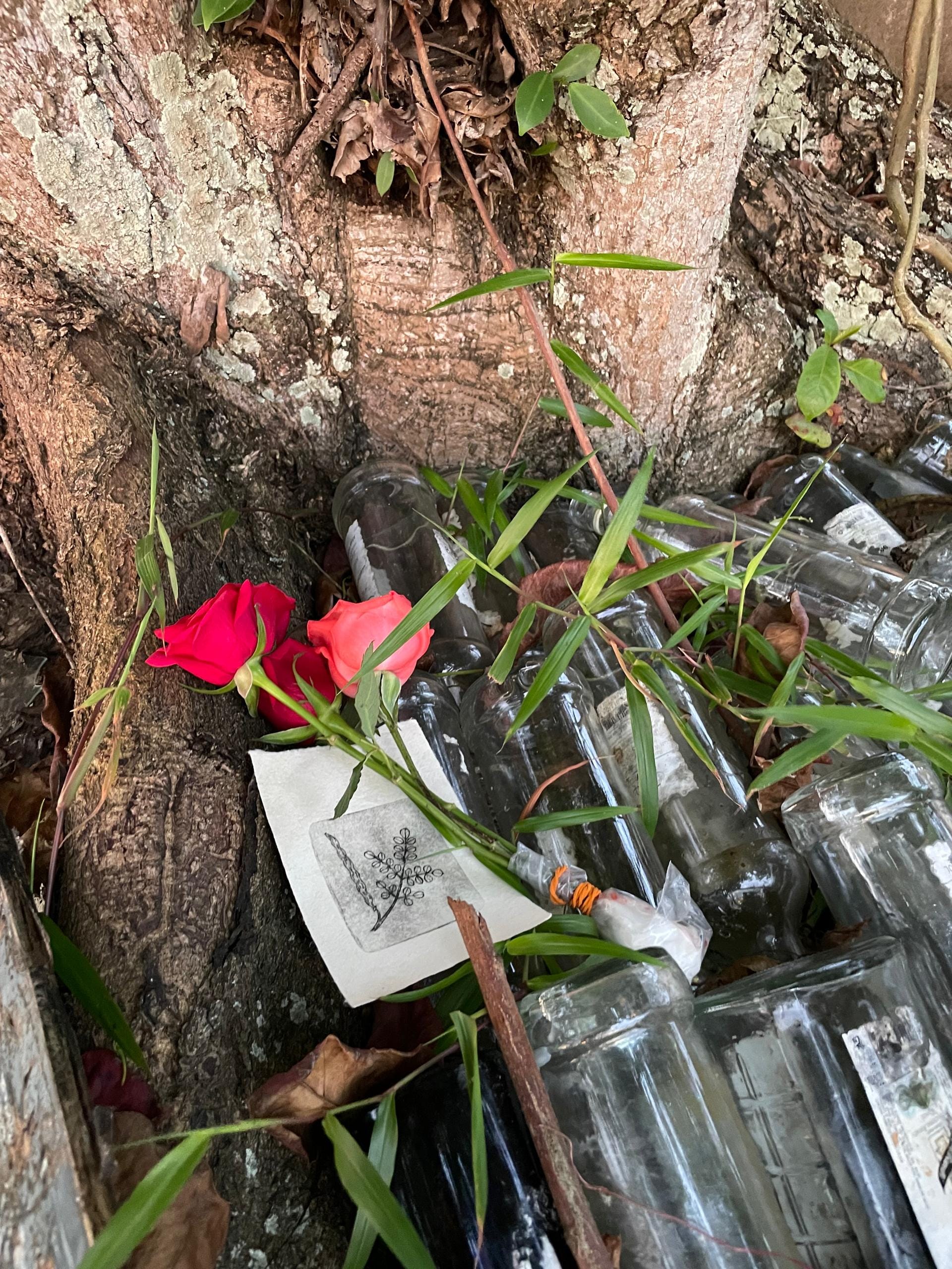 What else did I leave beneath the third tree down on the beach with the oil platform in the distance? A pristine 10 ringgit note I found curled around a mangrove root, that I picked up but didn't want to take home. Silly songs I sang to combat my fear of the dark, as I sat with Zedeck on the night of my 41st birthday, watching hermit crabs climb out of the sea. Dozens of empty alcohol bottles collected during a beach clean-up with Fadhila. A little etching of a moringa plant. Roses from my 42nd birthday. Prayers - for money, for peace, for our complaints about the refinery to be heard.
