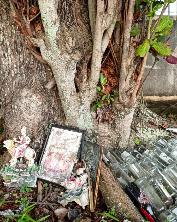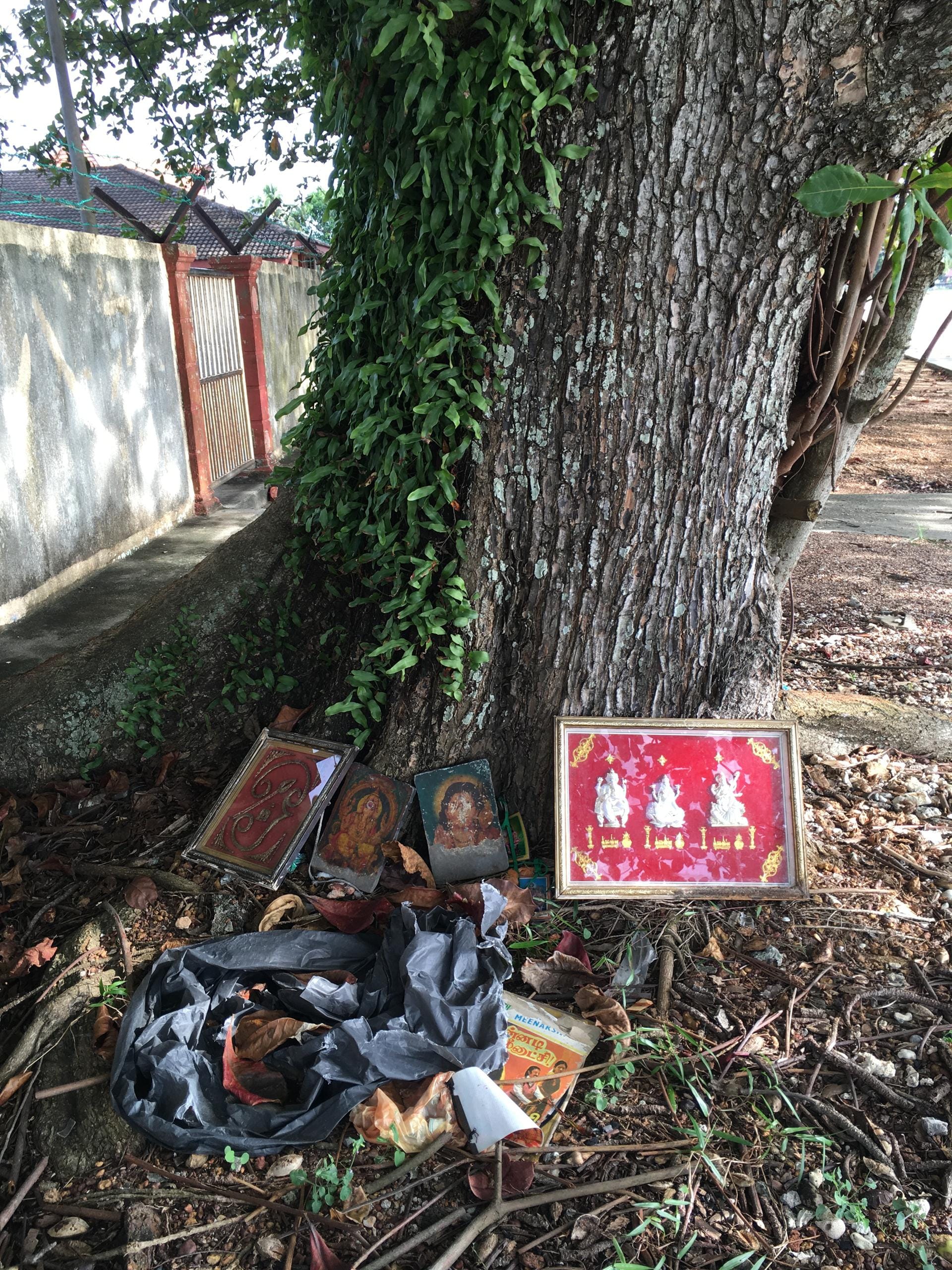 Early in the pandemic, someone lit a thoughtless fire to get rid of their rubbish and burned down Her Majesty Second-in-Row, Most Magnificent, Most Sado of Ketapangs. The trunk left a hollow wide enough for a young child to lie flat in. That hollow soon filled with trash. So people started abandoning their gods at the next tree down.