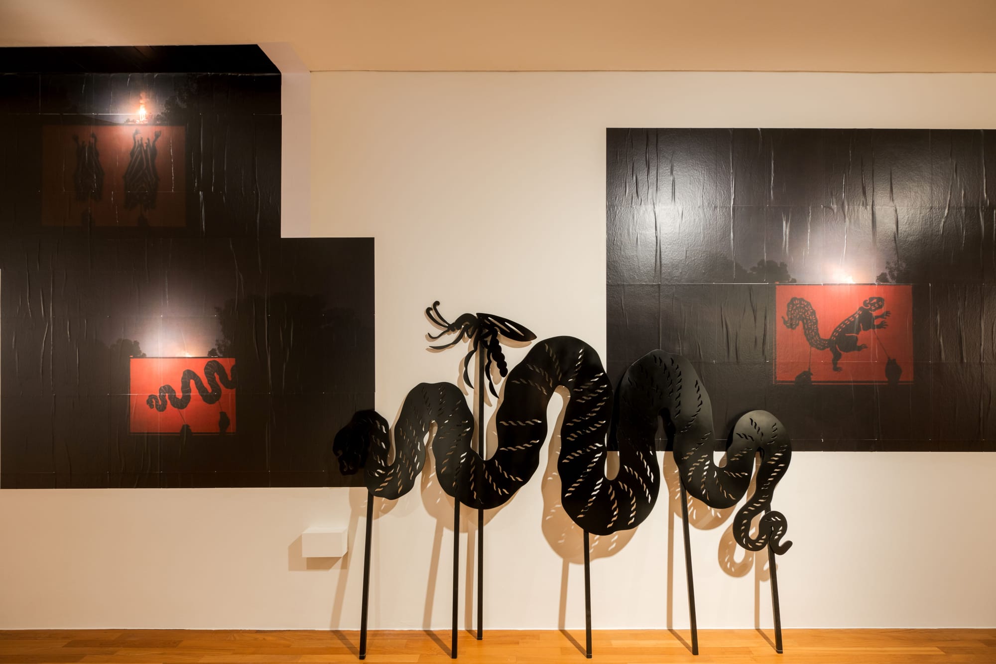 These are photos of shadow puppets, lit entirely by the flarestack of Hengyuan refinery. We shot at 3am, with no other source of direct light. “Creatures on the Move” is currently part of DALAM Southeast Asia: Figuring A Scene here at the Gallery, curated by Dr Flores. It’s in the space next to the one with Piyadasa’s May 13 work, actually.