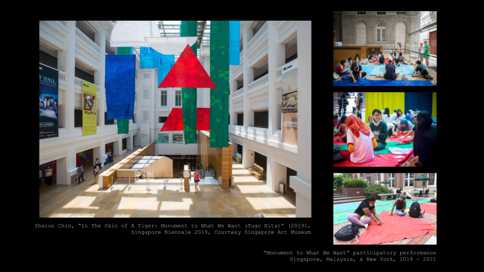 This all culminates in the 14th General Elections of 2018, in which Malaysia voted out the ruling Barisan Nasional government for the first time since the nation's founding in 1963. That election was known for having the most intense flag wars ever during campaign period, in terms of sheer volume of fabric. “In the Skin of A Tiger” was sewn out of patchwork fabric reclaimed from those political party flags. It's a monument - a soft one - that can fold away into two Ikea bags.