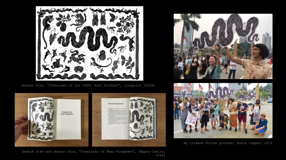 The print is also in Creatures of Near Kingdoms, a short story collection about fantastic flora and fauna set in Southeast Asia, written by my partner Zedeck Siew, illustrated by me. We enlarged the animals and took them to the streets for a climate protest in the capital.