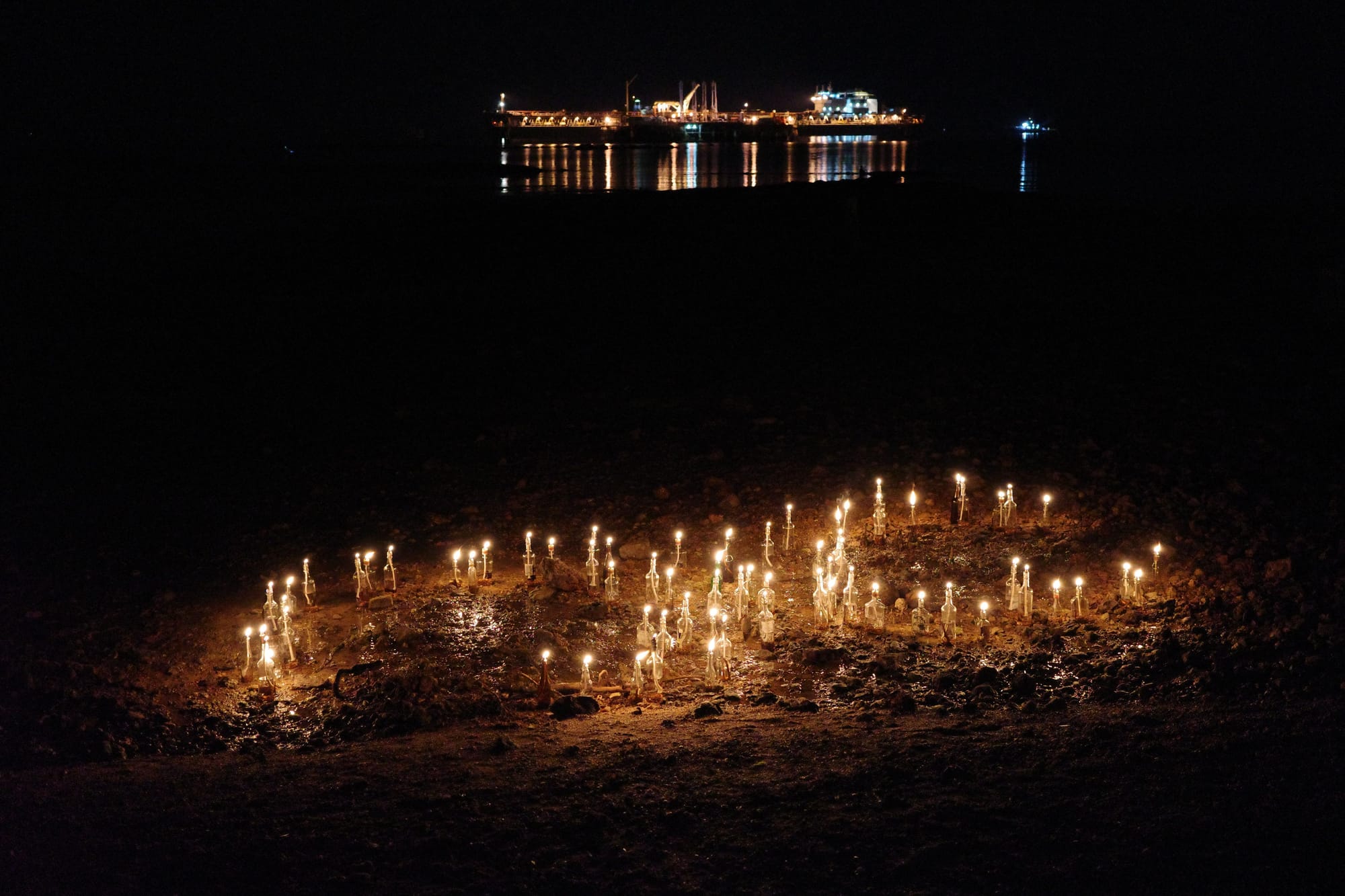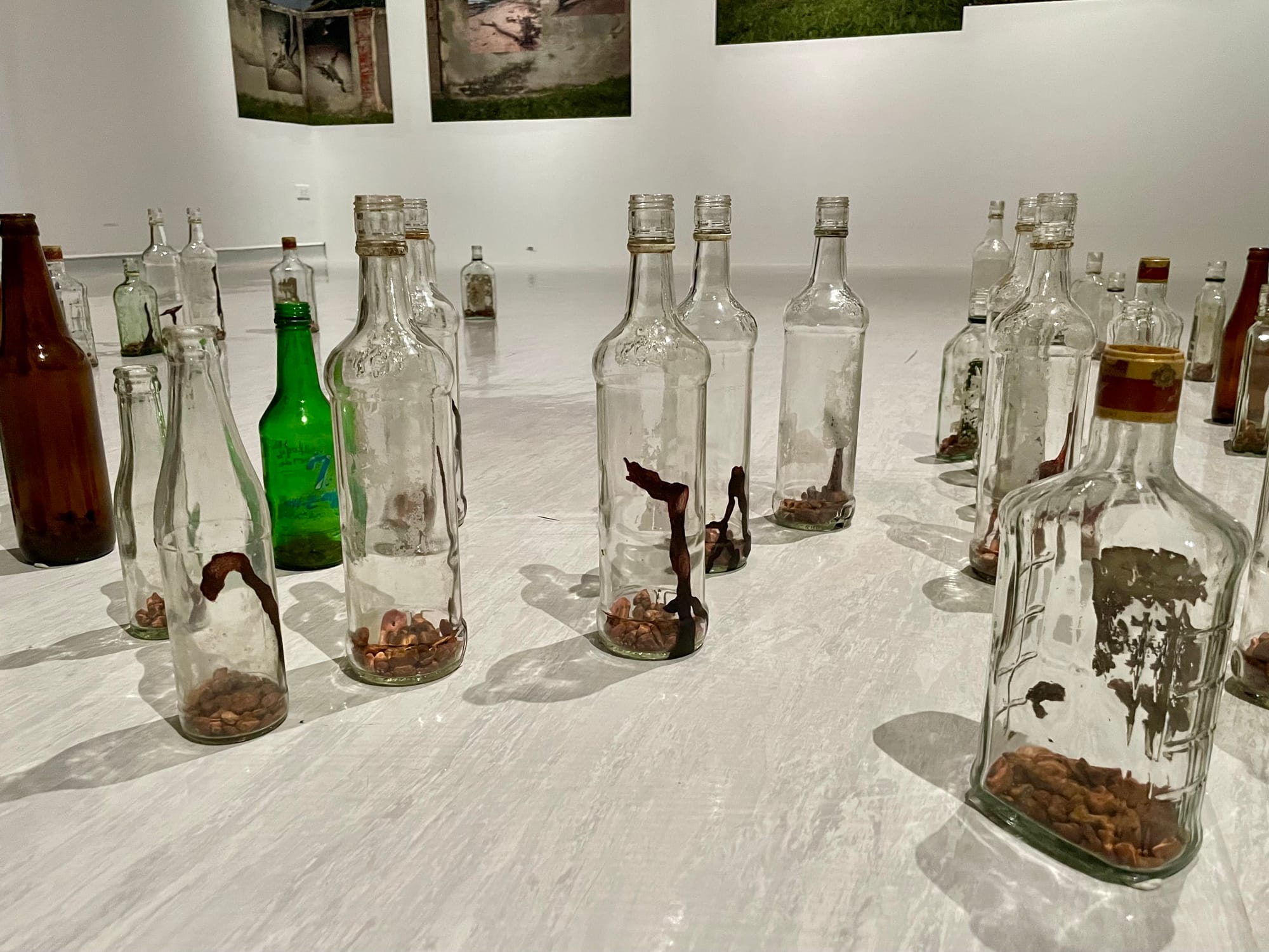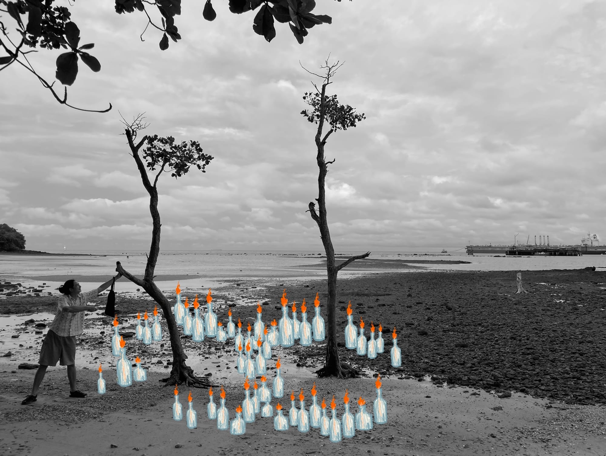 An image occurred to me, of these bottles arranged around the roots of the two mangrove trees, then lit on fire, at low tide.