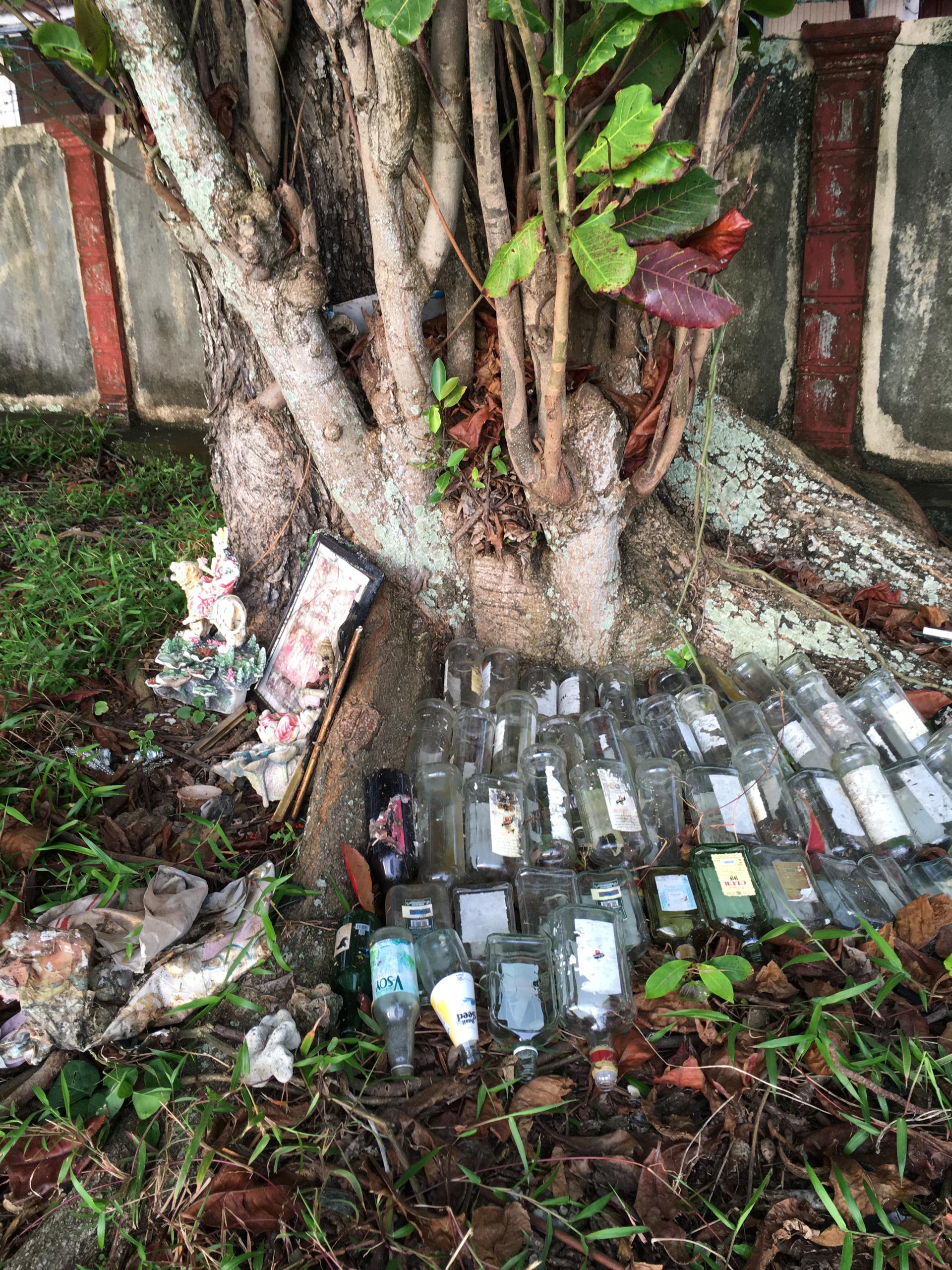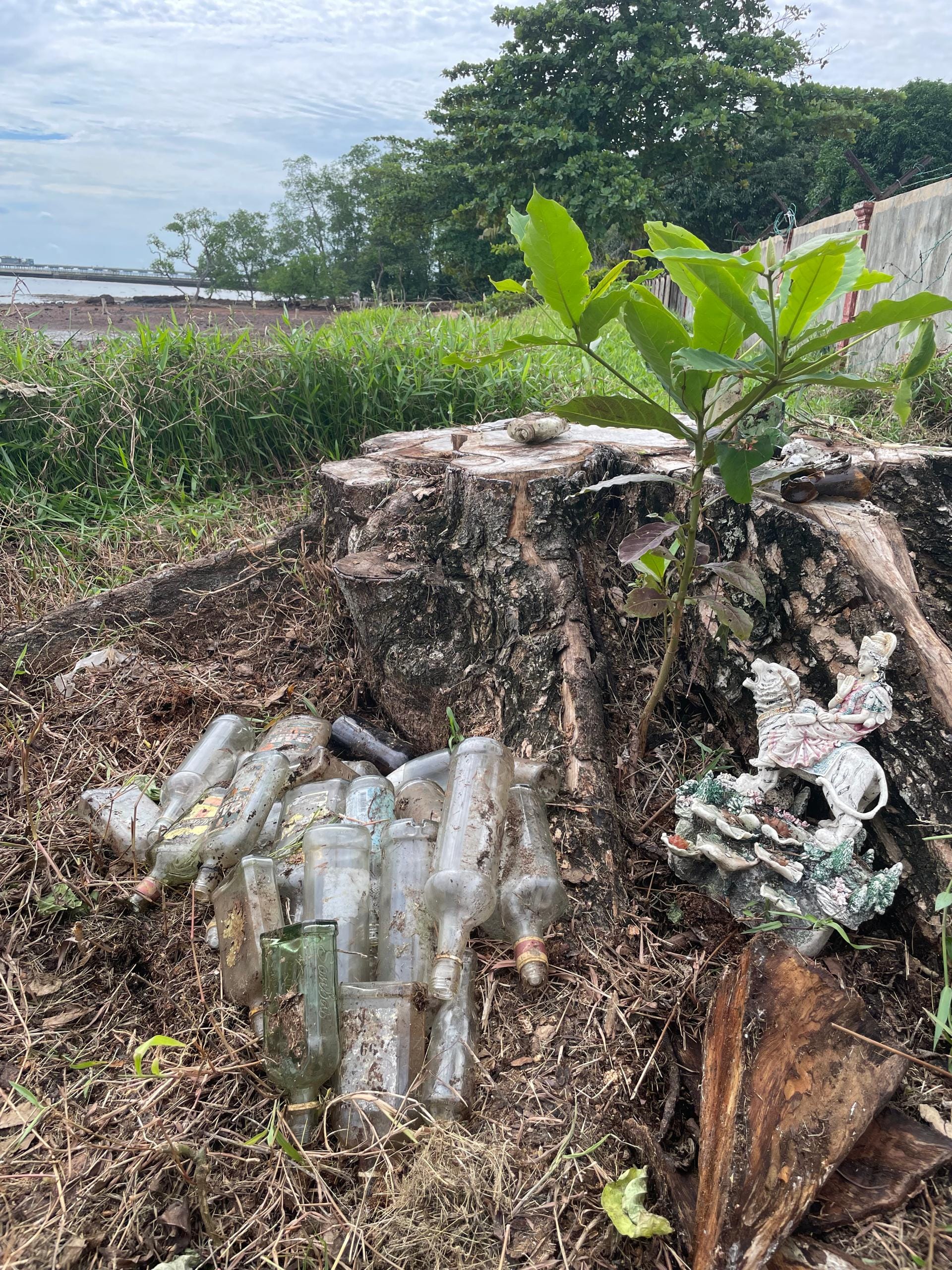 We collected dozens of them during beach clean-ups in 2022. Since glass isn't widely recycled in Malaysia anymore, we arranged them in rows at the feet of the ketapang trees on the back shore. Incredibly, when these trees were cut down last year, we found the bottles still buried in the earth, undamaged.