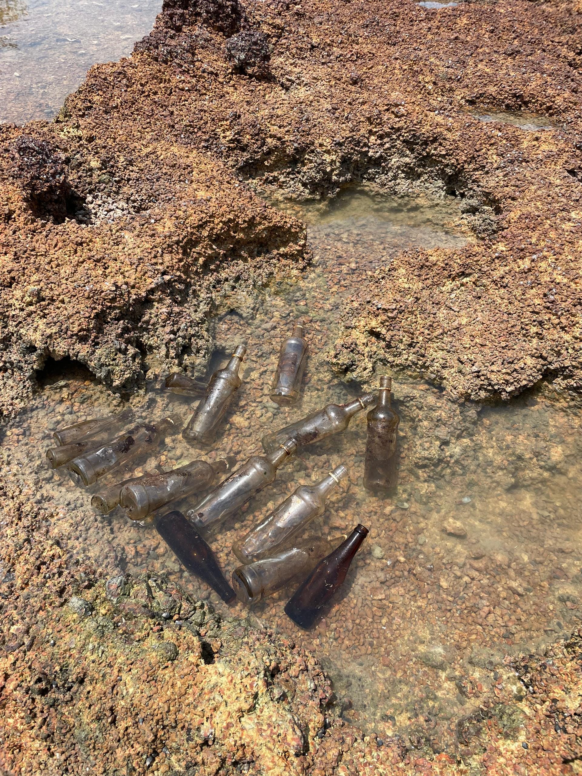 Left to Right: Bottles left at the Goddess tree in Oct 2022. Unearthing them in May 2024 and washing in a tide pool