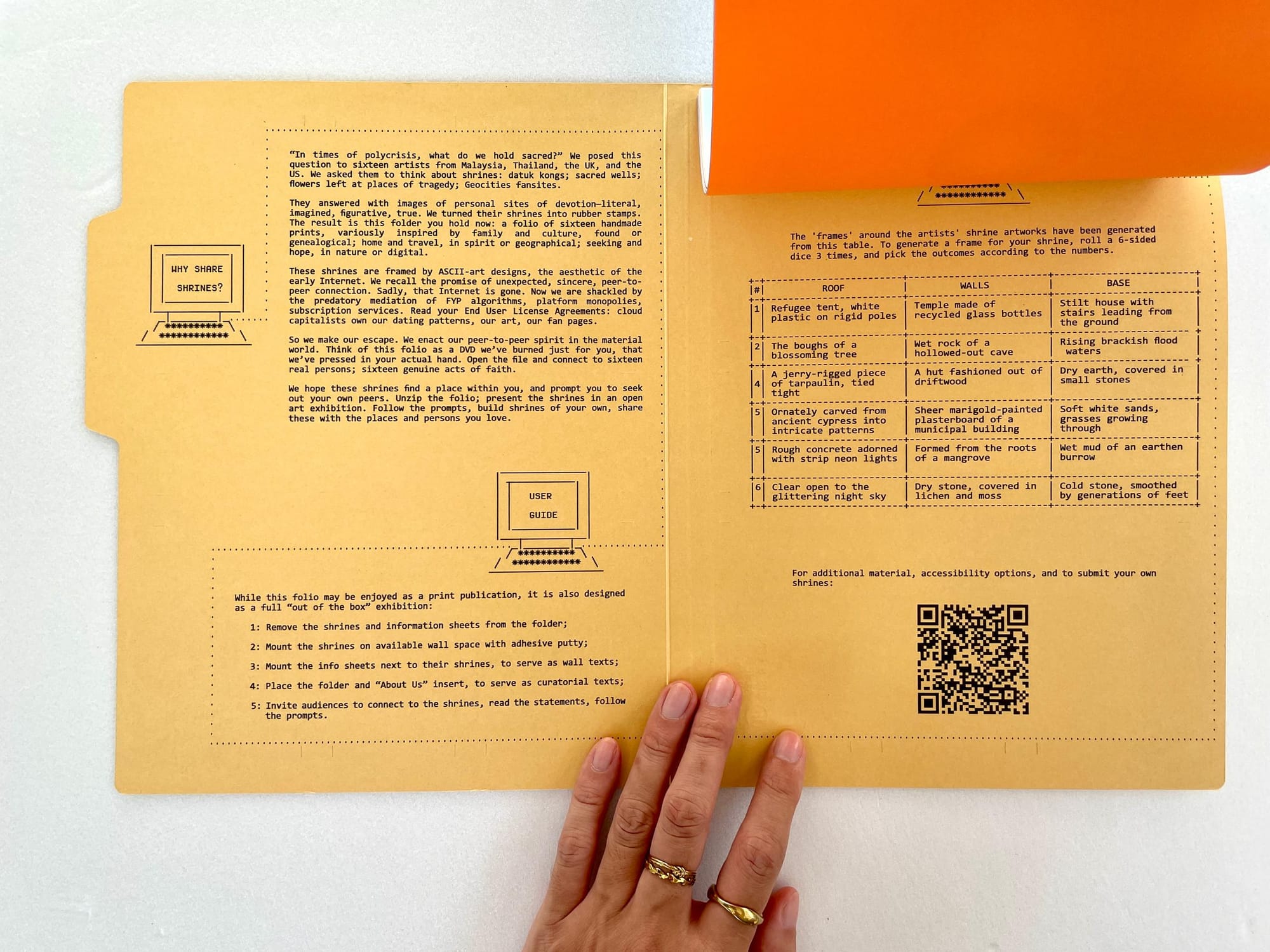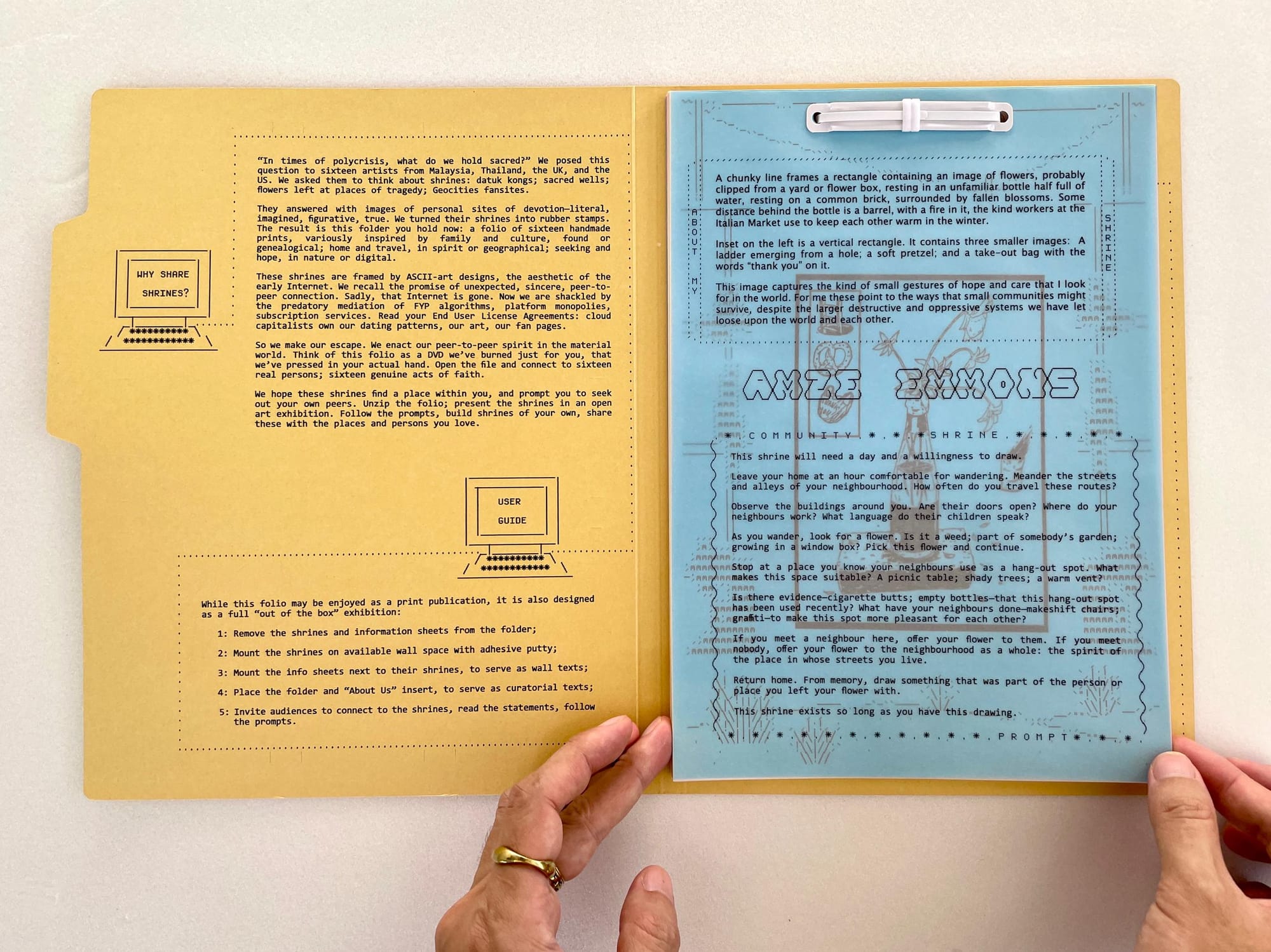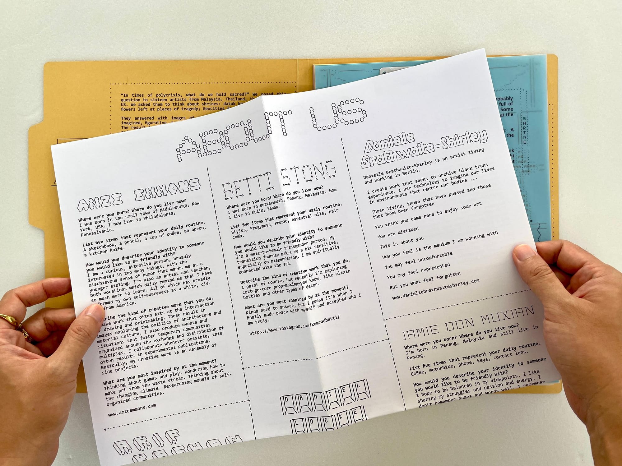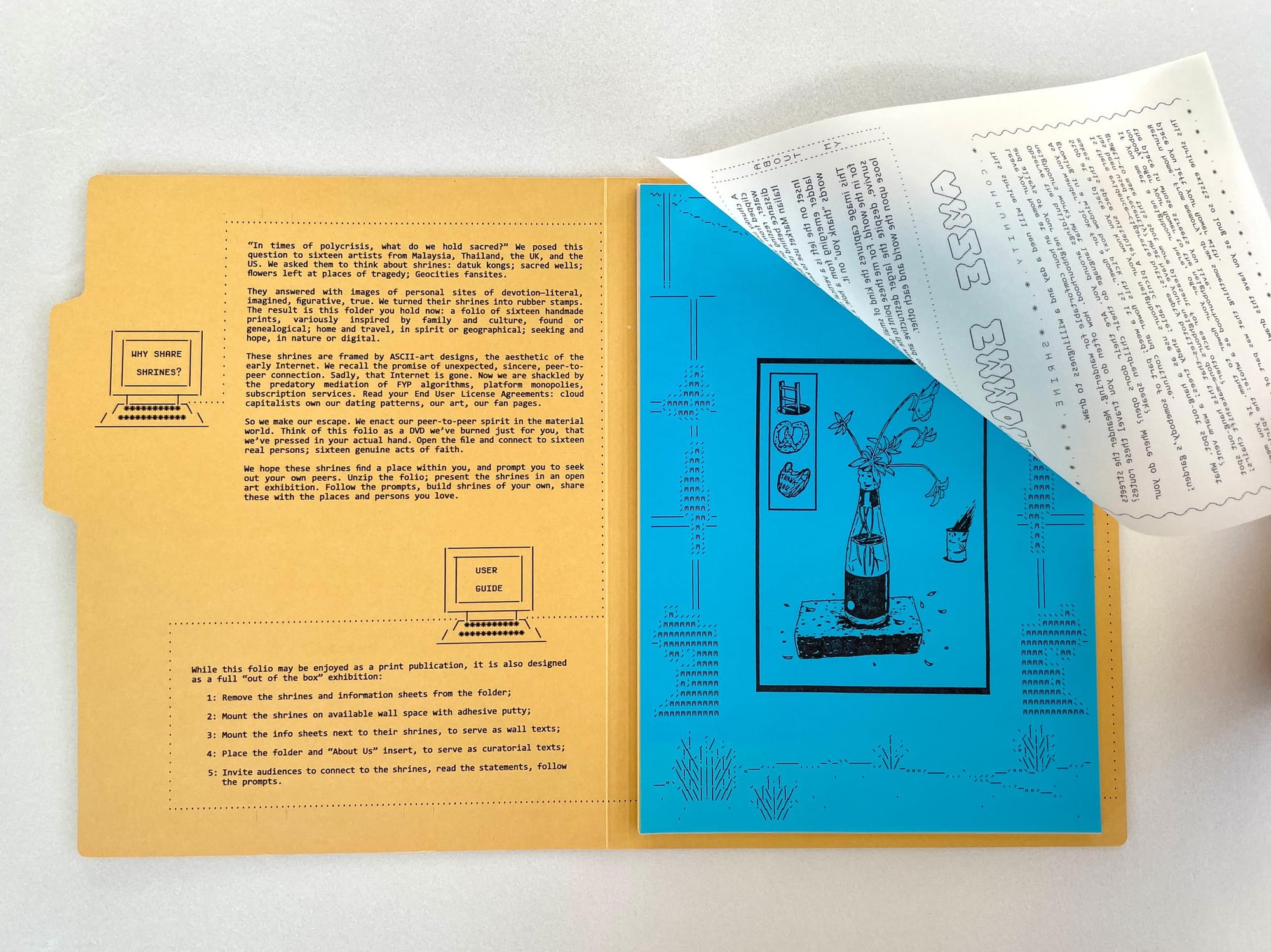 These shrines and their texts are bound in a cardboard folder, which is printed with essential information about the project. There's also an 'About Us' poster with biographies of the artists and curators.