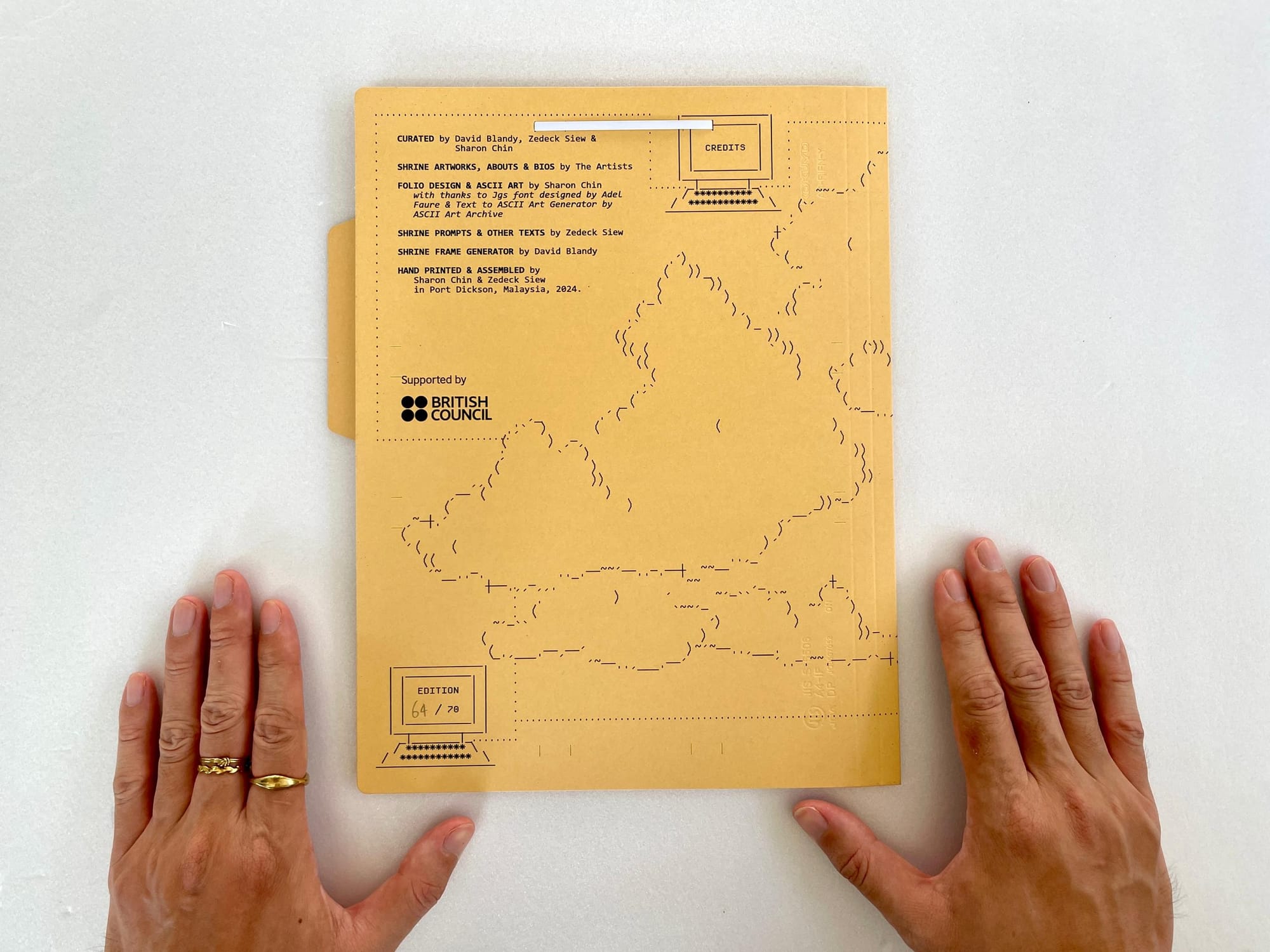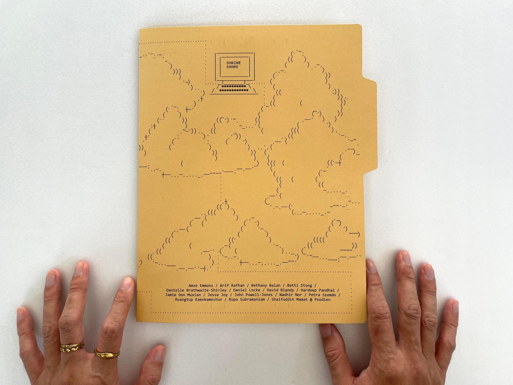 Shrineshare is a product of the internet. None of us had met face-to-face, at that point. Artworks came in via email, and we sent PDFs of them to our stamp maker over Whatsapp. Zedeck did all the rubber stamping - 1,120 prints inked and pressed by hand. We bound the digital with our life force into 70 folders, which were mailed, or otherwise put directly into the hands of artists, friends and strangers.