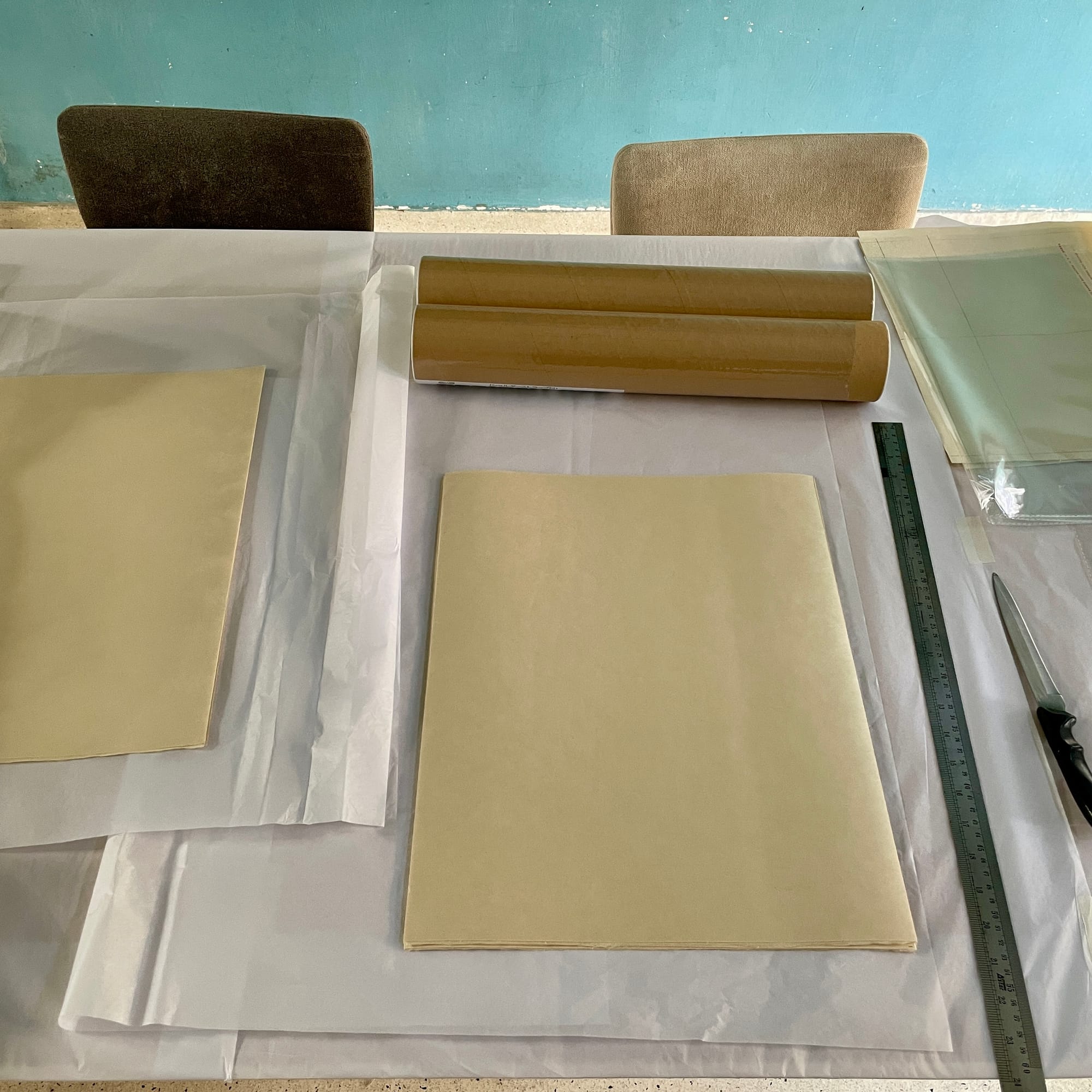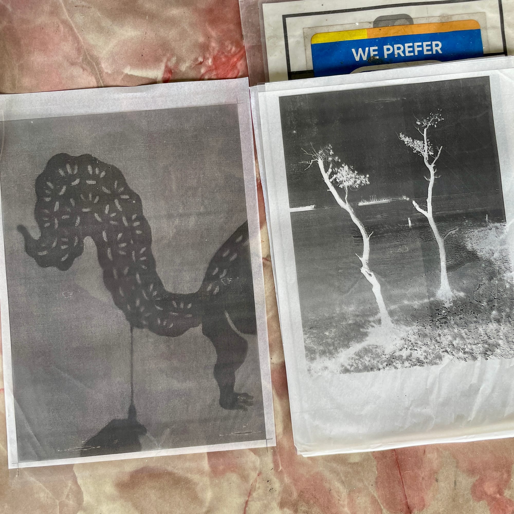 Took photos to the photocopy shop and had them turned into transparent negatives to experiment with solar printing. The uncle said: 'No one asks for this anymore', as he brushed a thick layer of dust off the box of transparencies.