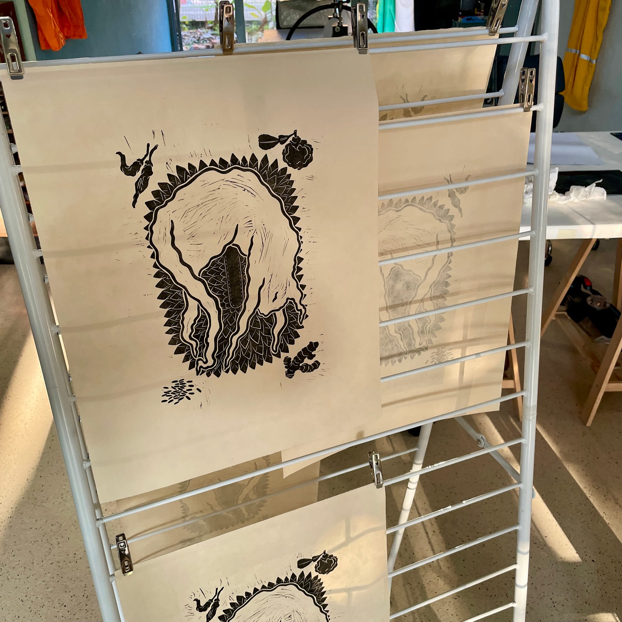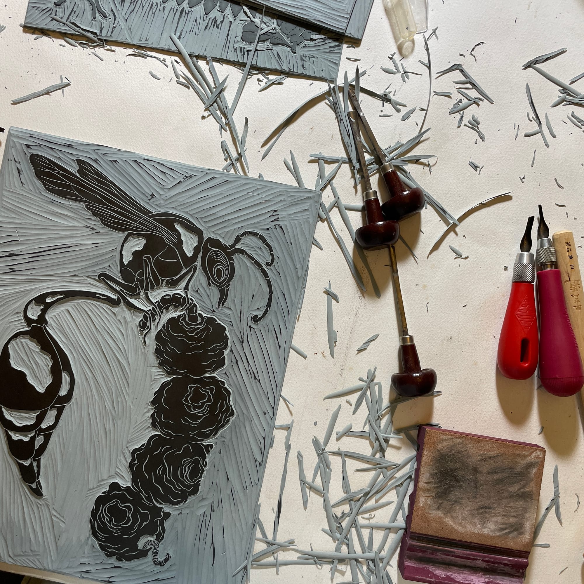 There was no more room for prints on the drying rack (ordered another one) so I cleaned up the blocks for "Auntie Wasp" and "Tunneling Otter". Some of these were carved in such a hurry that the wells (carved-out areas that are not inked) are shallower than I would like. They were ok to proof a print by hand, which was then scanned for Creatures or Near Kingdoms back in 2018, but I don’t think they would hold up to printing 20 editions in the press today.