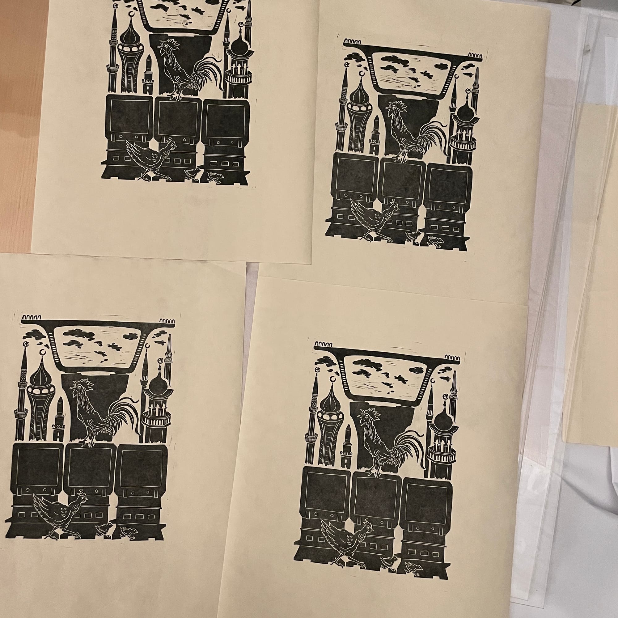 Printed five editions of "Urban Junglefowl". The Print Deities did NOT smile on me today. I kept getting uneven prints, and had to proof 5 or 6 times before I figured out the block was slightly warped. I bumped the bottom half of the block with a sheet of paper, then it was another few proofs before I could find the right balance of pressure. I need to start my printing sessions by proofing on cheap paper. Expensive lesson today.
