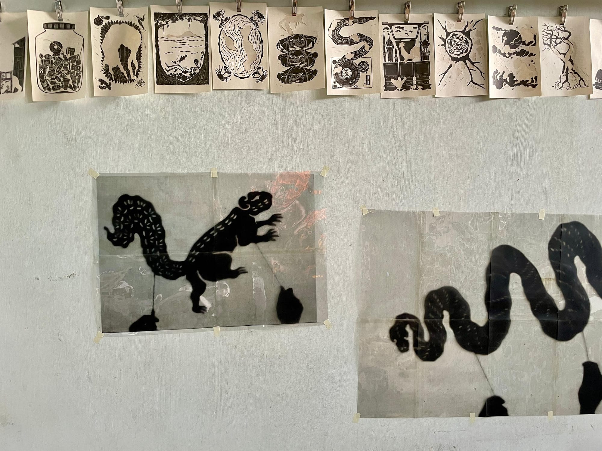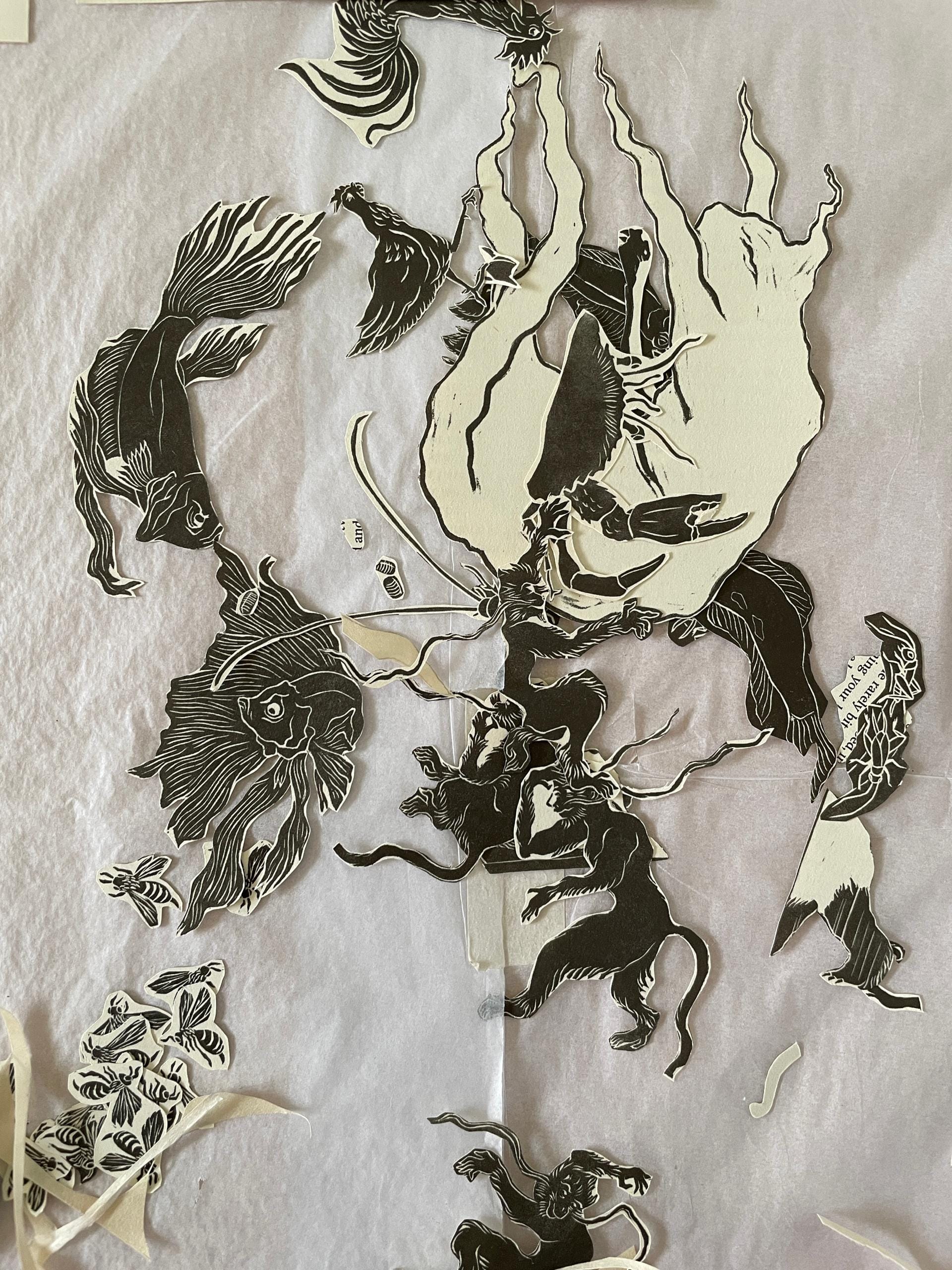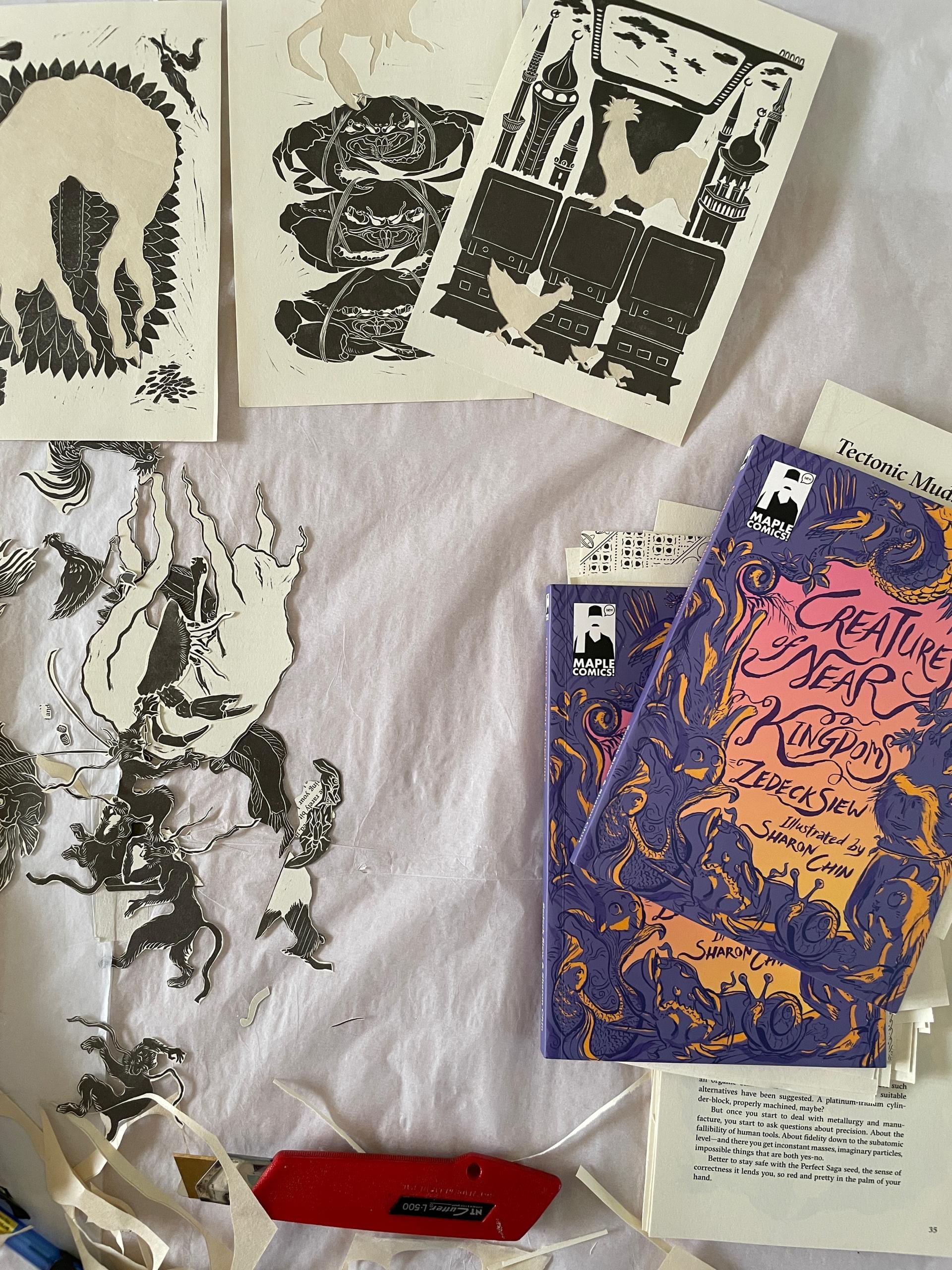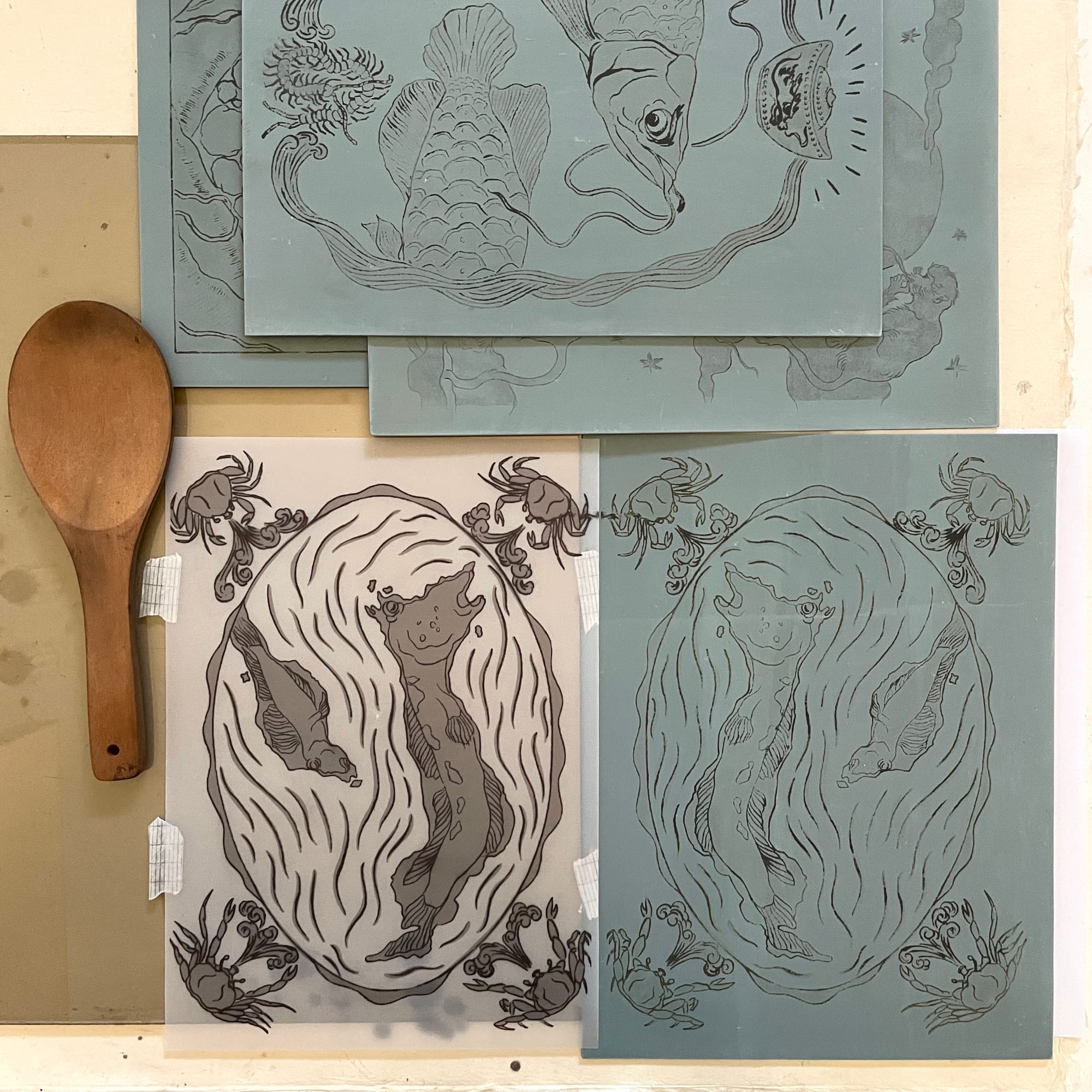 Transferred drawings for Monkey, Arowana, Mudskipper and Crocodile to lino. I haven’t seen anyone share this technique, so here goes: